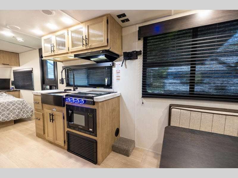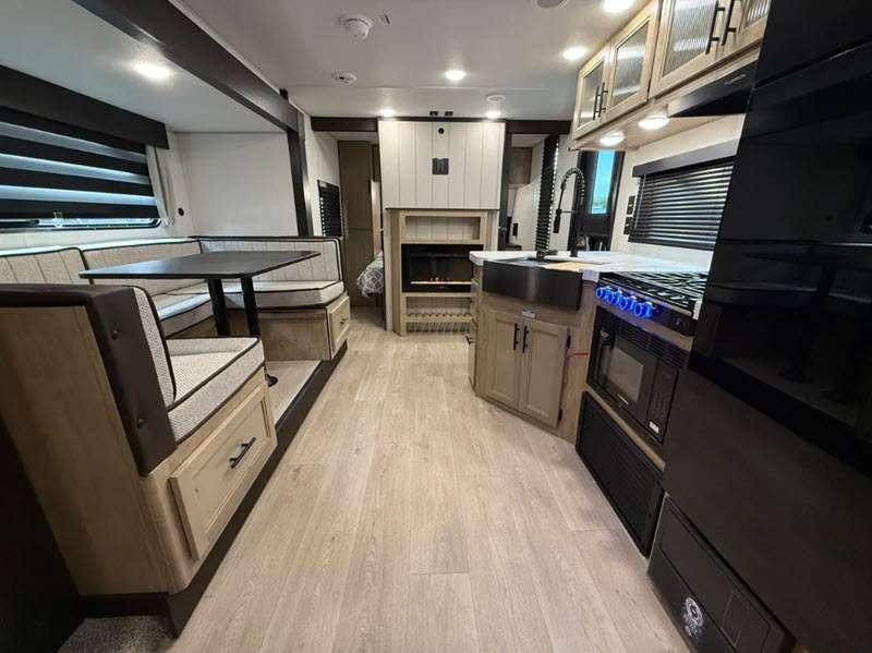 Sleeps 4 Slides 1 Length 33 ft 6 in Ext Width 8 ft Ext Height 10 ft 6 in Int Height 0 ft Hitch Weight 755 lbs GVWR 7755 lbs Dry Weight 5953 lbs Cargo Capacity 1802 lbs Fresh Water Capacity 52 gals Grey Water Capacity 38 gals Black Water Capacity 38 gals Furnace BTU 20000 btu Available Beds RV King Refrigerator Type 12V Cooktop Burners 3 Number of Awnings 1 Water Heater Type Tankless AC BTU 15000 btu Cargo Deck Size 0 ft Awning Info 14' Full Length Power w/LED Light Strip Axle Count 2 Shower Type Tub/Shower Combo Solar Wattage 200 watts Similar Floorplans