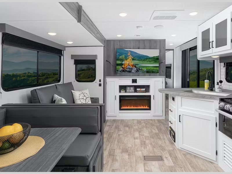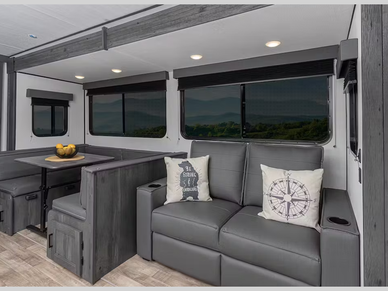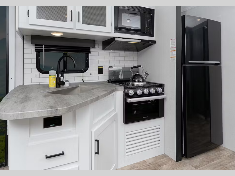 Inside, you'll enjoy blackout night shades, LED lighting, a stainless-steel sink, and pressed membrane premium countertops. The tankless water heater will provide endless hot showers and the 30k BTU furnace will help keep you warm on chilly evenings. Each model is also SolarFlex ready for off-grid capabilities, and there is Furrion backup camera prep for the option to make parking smoother.
