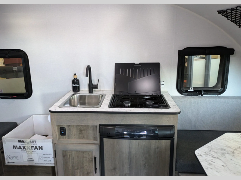 Sleeps 2 Slides 1 Length 16 ft 11 in Ext Width 6 ft 6 in Ext Height 8 ft 2 in Int Height 6 ft 4 in Hitch Weight 179 lbs Dry Weight 1975 lbs Fresh Water Capacity 15 gals Grey Water Capacity 15 gals Black Water Capacity 15 gals Tire Size 14" Furnace BTU 20000 btu Available Beds Queen Axle Count 1 Number of LP Tanks 1 Shower Type Standard -