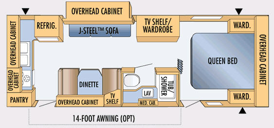 Single Slide, Rear Kitchen w/3 Burner Range, Refrigerator, Double Kitchen Sink, J-Steel Sofa Slideout w/Overhead Cabinet, Booth Dinette, TV Shelf, Tub/Shower, Medicine Cabinet, TV Shelf/Wardrobe, Front Queen Bed w/Wardrobes Both Sides, and More.